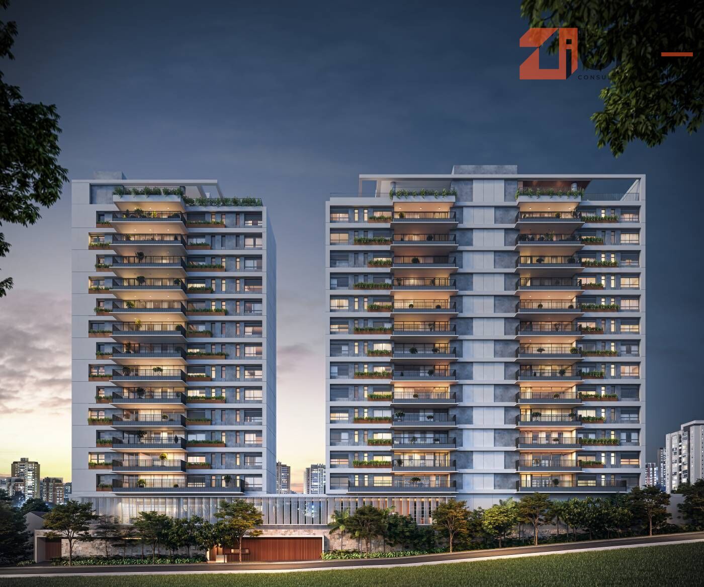 Apartamentos de 3 e 4 suítes, com plantas flexíveis, opção de unidades giardino e coberturas duplex.