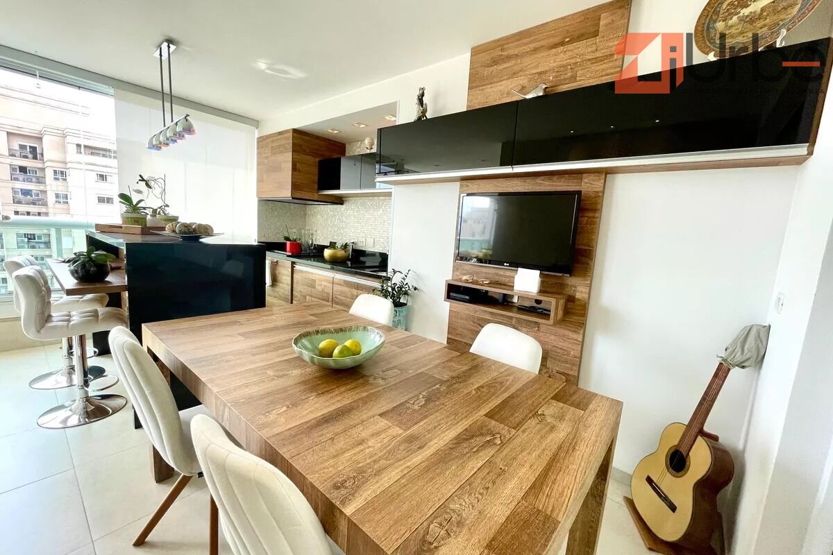 Dispõe de lavabo, 3 suítes, além de escritório, cozinha planejada, área de serviço, dependência e banheiro de serviço. A marcenaria é de altíssimo padrão, com mobília de excelente qualidade e ar-condicionado instalado. A área social é privativa e o espaço sala-varanda é amplo e sofisticado.