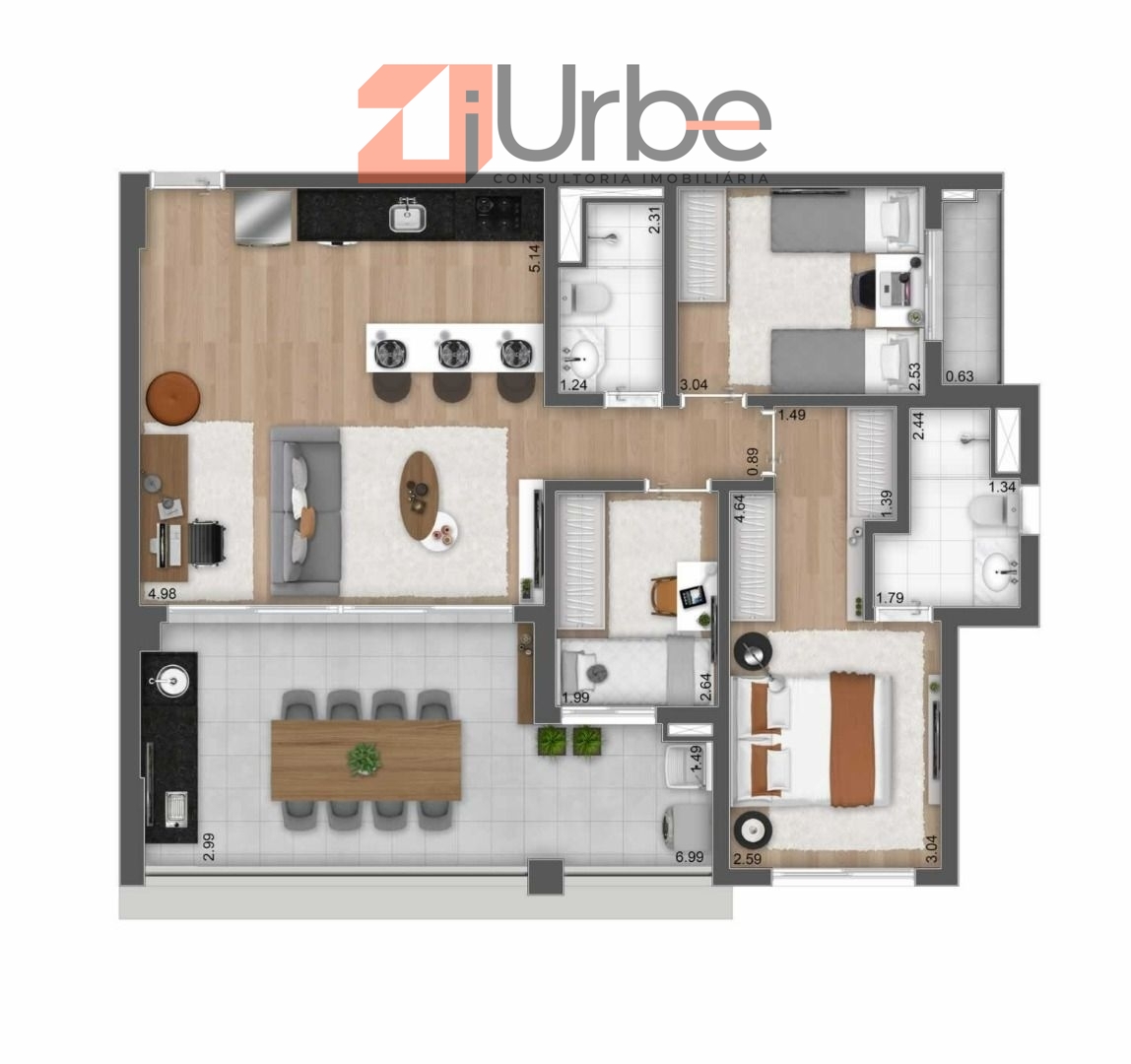 - apartamento 92m², 3 dormitórios, sendo 1 suíte ( com terraço), sala e cozinha integradas, infra para ar condicionado ( com terraço técnico), varanda, 1 vaga de garagem.