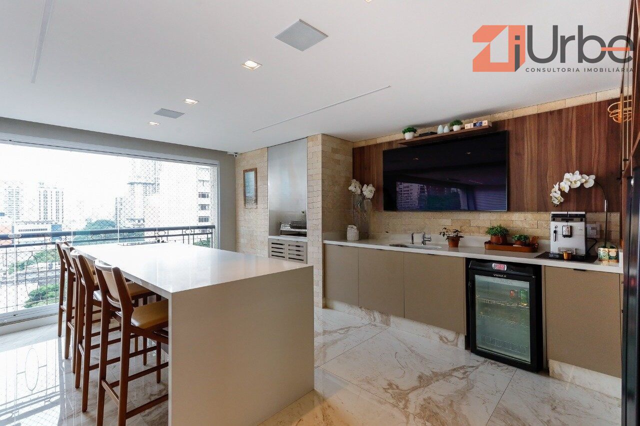 A varanda gourmet é espaçosa, fechada com vidro e equipada com churrasqueira, exaustor adicional, cervejeira, adega, espaço para café e bancada com cooktop. A cozinha é completa, com despensa, espaço para duas geladeiras, torre de fornos e armários planejados. O imóvel conta ainda com área de serviço, dependência completa e 5 vagas de garagem com depósito privativo.